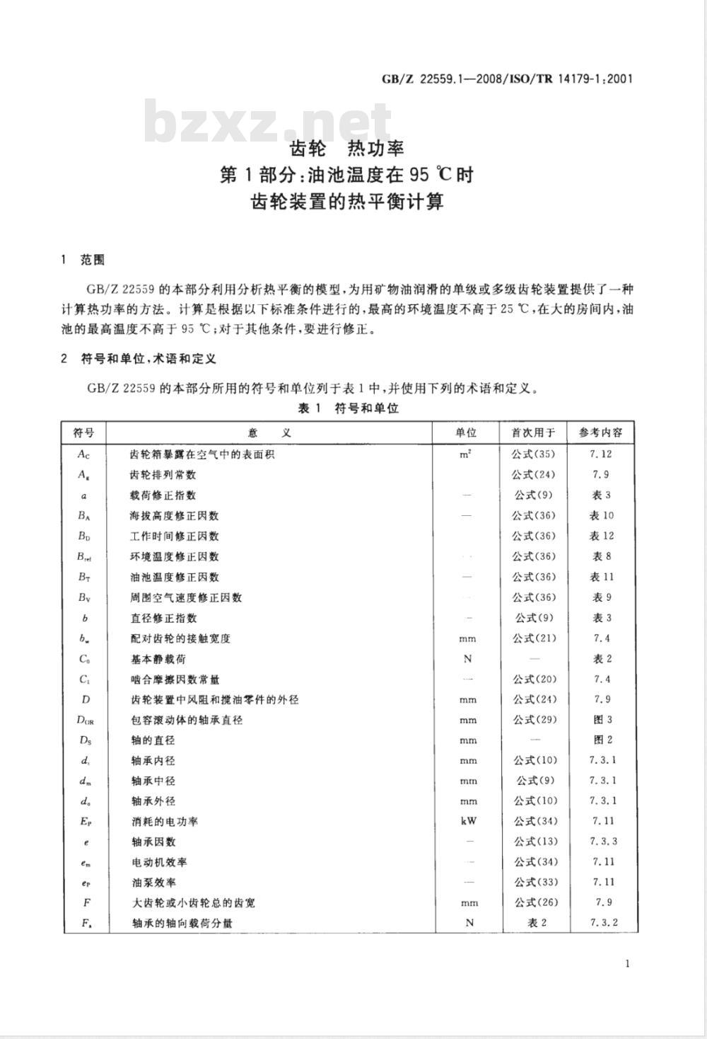GB/Z22559的本部分利用分析热平衡的模型,为用矿物油润滑的单级或多级齿轮装置提供了一种计算热功率的方法。计算是根据以下标准条件进行的,最高的环境温度不高于25℃,在大的房间内,油池的最高温度不高于95℃;对于其他条件,要进行修正。2符号和单位,术语和定义