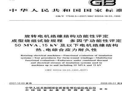Rotating electrical machines-Functional evaluation of insulationsystems-Test procedures for form-wound windingsMultifactorfunctional evaluation-Endurance under combined thermaland electrical stresses of insulation systems used inmachines up to and including 50MVA and 15 kv(IEC60034-18-33:1995,IDT)2007-12-03发布