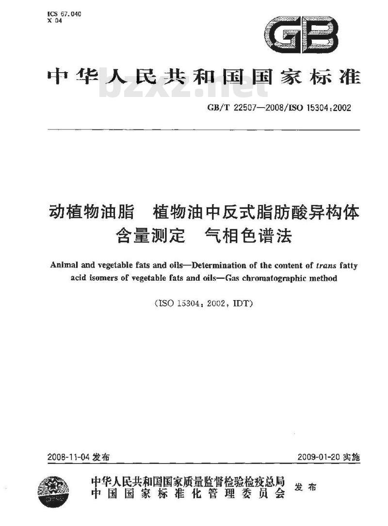 GB/T 22507—2008/IS0 15304:2002本标准等同采用ISO15304:2002%动植物油胎植物油中反式脂肪酸异构体含基测定气相色谱