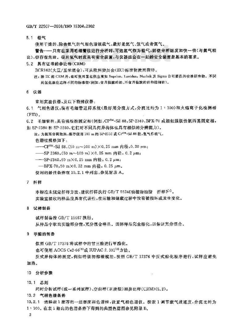 下列文件中的条款通过本标准的引月而成为本标唯的条款。是注日期的引用文件,其随后所有的修改单(不包括勘误的内容)或修订版均不适用于本标准,然而,鼓励根据本标难达成协议的各方研究是否可使用这些文件的最新版本。凡是不注日期的引用文件,其最新版本运用于本标准。GB/T15687动植物油胎试样的备GB/T15687--2008,ISOG61.2003,IDT)GB/T17376动植物油脂脂肪酸甲酯制备GB/T17376—2008.TSO5509:2000,IDT)3术语和定义