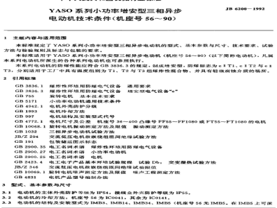 本标准规定了YASO系列小功率增安型三相异步电动机的型式、基本参数与尺寸、技术要求、试验方法与检验规则及标志与包装的要求。本标准适用于YASO系列小功率增安型三相异步电动机(机座号56~90)(以下简称电动机),凡属本系列电动机所派生的各种系列电动机也可参照执行。本系列电动机的防爆性能应符合GB3836.3的规定,制成增安型,防爆标志为eT1、e1T2与eIT3,分别适用于工厂中具有温度组别为T1、T2与T3组爆炸性混合物、并具有轻微腐蚀介质的场所。2引用标准