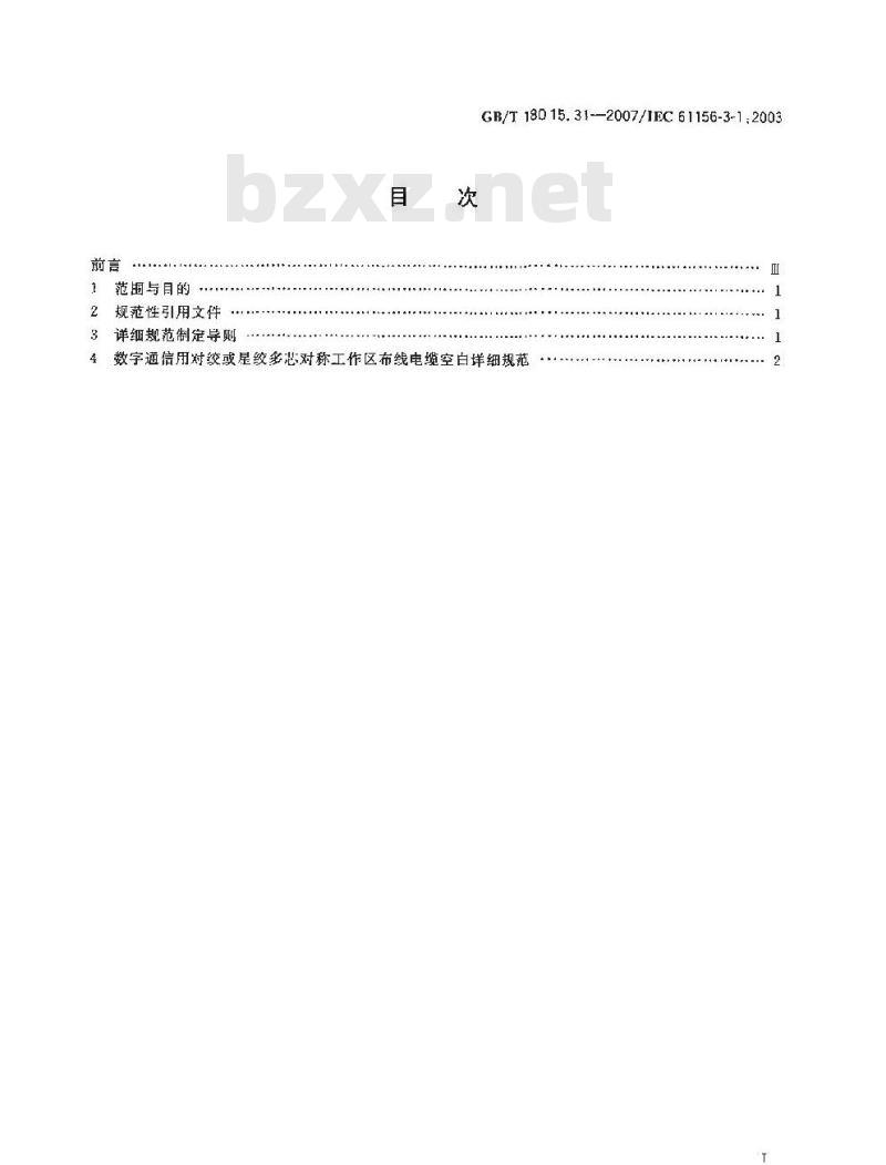 本部分为GB/T18015的第31部分。本部分等商采用E61156-3-1:2003数详通信用对绞或菌绞多芯对称电缆第3-1部分:工作区布线电缆空有摔细规范《英文版)。考虑到我国国确和使于使用,本部分在等同采用IEC61156-3-1:2003时做了几处候改:一本部分第2牵引用了采用国际标推的我国标准而非国际标推:一将一些适用于国际标准的表述改为适用于我国标准的表述本部分代替G路/T18015.5----1999数字通信用对戒星绞多芯对称电缆第5部分:工作区布线电缆空白详现范,本部分与G13/T18015.5--1999的主要变化如下:GB/T 18015.31—2007/1EC 61156-3-1:2003一增加相时延及时延差的要求(1999年版第4章中无:见本版的第4章传输性能”中);一一增加电缆远端串育的要求(1999年版第4章中无,见本版的第4章“传输性能”中)。本部分山中国电器工业协会提出。本部分由全国电线电缆标推化技术委员会归日。本部分负资起草单位:上海电缆研究所。本部分参加起草单位:宁波东方集团有限公司、江苏东强股份有限公司、江苏水鼎股份有限公司、浙江兆龙线缆有限公司、西安西电光电缆有限资任公司、江苏亨通集团有限公司、安徽新科电缆股份有限公司。