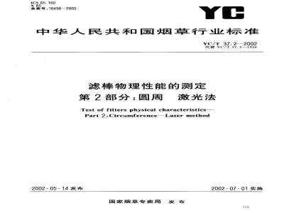 本部分与YC/T37.2-1996相比主要变化如下:增加了激光法测定滤棒圆周的方法;将YC/T37.2—1996调整为附录B。本部分的附录A、附录B为资料性附录。本部分由国家烟草专卖局提出。本部分由全国烟草标准化技术委员会(TC144)归口。本部分起草单位:中国烟草标准化研究中心。本部分主要起草人:赵航、周德成、李晓晖、冯晓民、王云芳本部分所代替标准的历次版本发布情况为:YC/T37.2--1996。5.5.1