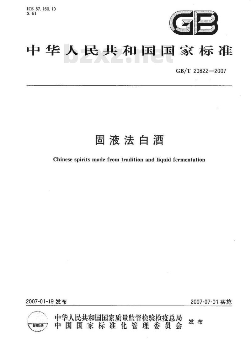 本标准规定了固液法白酒的定义、产品分类、要求、分析方法、检验规则和标志、包装、运输、贮存。 本标准适用于固液法白酒的生产、检验与销售。 GB/T 20822-2007 固液法白酒 GB/T20822-2007 标准下载解压密码:www.bzxz.net