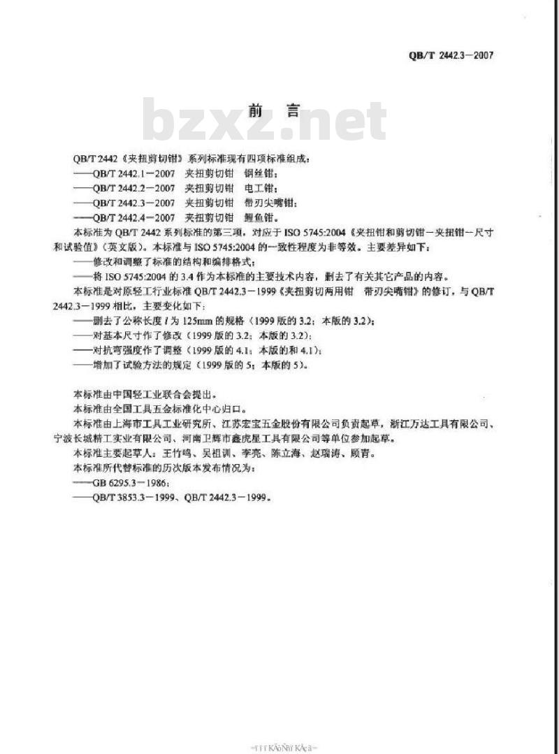 本标准为QB/T2442系列标准的第三项,对应于IS05745:2004夹扭钳和剪切钳一夹扭钳一尺寸和试验值》(英文版),本标准与ISO5745:2004的一致性程度为非等效。主要差异如下:修改和调整了标准的结构和编排格式将IS05745:2004的3.4作为本标准的主要技术内容,去了有关其它产品的内容。本标准是对原轻工行业标准QB/T2442.3一1999夹扭剪切两用钳带刃尖嘴钳的修订,与QB/T2442.3一1999相比,主要变化如下:一删去了公称长度1为125mm的规格(1999版的3.2:本版的3.2):对基本尺寸作了修改(1999版的3.2:本版的3.2):对抗弯强度作了调整(1999版的4.1:本版的和4.1):增加了试验方法的规定(1999版的5:本版的5)。本标准由中国轻工业联合会提出。本标准由全国工具五金标准化中心妇口。本标准由上海市工具工业研究所、江苏宏宝五金股份有限公司负责起草,浙江万达工具有限公司、宁波长城精工实业有限公司、河南卫辉市鑫虎星工具有限公司等单位参加起草。本标准主要起草人王竹鸣、吴祖训、李亮,陈立海、赵瑞涛、顾青。本标准所代替标准的历次版本发布情况为:GB6295.3-1986;