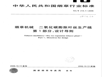 YC/T 214的本部分规定了二氧化碳膨胀叶丝生产线设计的基本原则和一般要求。本部分适用于二氧化碳膨胀叶丝生产线设计及整线中整机的系列化设计。 YC/T 214.1-2006 烟草机械 二氧化碳膨胀叶丝生产线 第1部分:设计导则 YC/T214.1-2006 标准下载解压密码:www.bzxz.net
