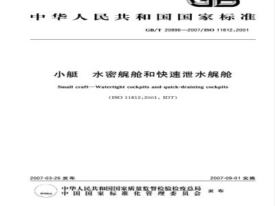 GB/T20896—2007/ISO11812:2001水密舰舱和快速泄水舱》(英文版)。本标准等同采用IS011812:2001《小艇本标准等同翻译IS0118122001。为便于使用,本标准做了下列编辑性修改:“本国际标准”一词改为“本标准”;用小数点“,”代替作为小数点的逗号“,”;删除国际标准的前言和引言。