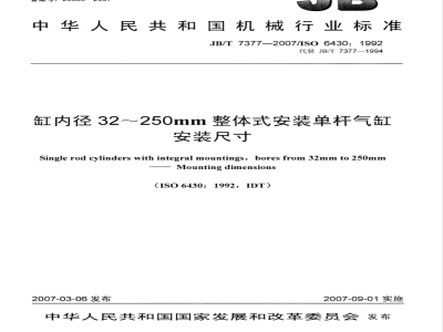 JB/T7377—2007/IS06430:1992本标准等同采用IS06430:1992《气动一整体安装单杆气缸,1000kPa(10bar)系列,缸径32~250mm一安装尺寸》。