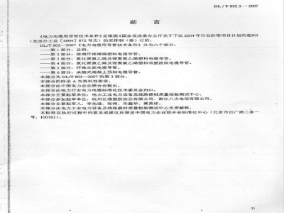 《电力电缆用导管技术条件》是根据《国家发改委办公厅关于下达2004年行业标准项目计划的通知》(发改办工业【2004】872号文)的安排制(修)订的。DL/T802—2007《电力电缆用导管技术条件》分为六个部分:一第1部分:总则。