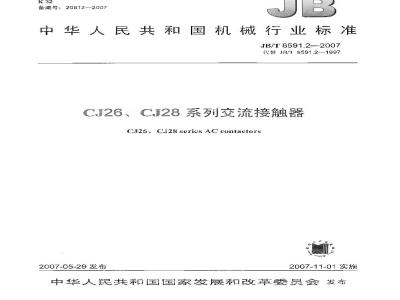 JB/T8591《交流接触器》分为三个部分:—-第1部分:CJ20系列交流接触器;第 2部分:CJ26、CJ28系列交流接触器;一第3部分:CJ40系列交流接触器本部分代替JB/T8591.2--1997《CJ26、C328系列交流接触器》。本部分与B/T8591.2一1997相比,主要变化妮F:将机械寿命和电寿命试验、耐低温性能试验作为特殊试验:介电性能直接引用最新的GB14048.4--2003的要求:去掉了绝缘材料和比电痕化掐数(CTI)的测定:约定操作性能和电寿命试验试后耐压值都政为2U.但不小:1000V:对于采用电子线跨的接触器,增加了EMC试验的要求:取消了定期试验的要求。