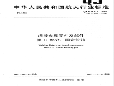 QJ1145.1A~1145.33A-—2007、QJ1145.34—2007、QJ1145.35——2007《焊接夹具零件及部件》分为35个部分,并与标准QJ1146A一2007《焊接夹具零件及部件技术要求》配套使用。本部分代替QJ1145.11一1987《焊接夹具零件及部件第11部分:圆定位销》。本部分与QJ1145.11—1987相比主要变化如下:-细化标记内容;