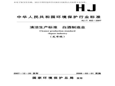 本标准规定了白酒制造业清洁生产的一般要求。本标准将清洁生产指标分为六类,即生产工艺与装备要求、资源能源利用指标、产品指标、污染物产生指标(末端处理前)、废物回收利用指标和环境管理要求。本标准适用于白酒生产企业的清洁生产审核、清洁生产潜力与机会的判断、清洁生产绩效评定和清洁生产绩效公告制度,也适用于环境影响评价、排污许可证管理等环境管理制度。 HJ/T 402-2007 清洁生产标准 白酒制造业 HJ/T402-2007 标准下载解压密码:www.bzxz.net