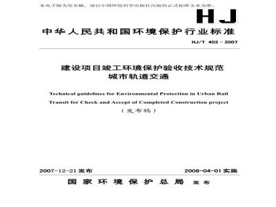 本标准规定了城市轨道交通建设项目竣工环境保护验收的一般技术性规范要求。本标准适用于城市轨道交通的新建、改建、扩建和技术改造项目竣工环境保护的验收。其他与城市轨道交通项目有关的环境影响评价、环境保护工程设计、建设项目竣工后的日常监督管理性监测亦可参照执行。 HJ/T 403-2007 建设项目竣工环境保护验收技术规范 城市轨道交通 HJ/T403-2007 标准下载解压密码:www.bzxz.net