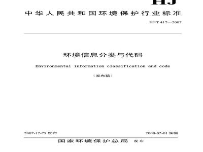 本标准对环境管理、环境科学、环境技术、环境保护产业等与环境保护相关的信息进行分类并编写代码;本标准只规定环境信息分类的基本框架和代码。 本标准适用于全国各级环境保护部门的环境信息采集、交换、加工、使用以及环境信息系统建设的管理工作。 HJ/T 417-2007 环境信息分类与代码 HJ/T417-2007 标准下载解压密码:www.bzxz.net
