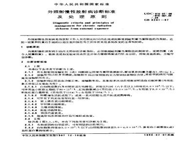 本标准规定了外照射慢性放射病诊断标准及处理原则。本标准适用于职业性放射工作人员,非职业性受照射人员也可参照本标准诊断和治疗。 GB 8281-2000 外照射慢性放射病诊断标准及处理原则 GB8281-2000 标准下载解压密码:www.bzxz.net