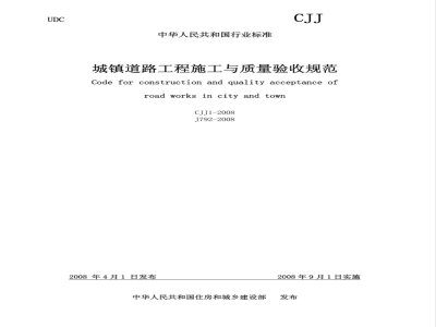 关于发布行业标准《城镇道路工程施工与质量验收规范》的公告现批准《城镇道路工程施工与质量验收规范》为行业标准,编号为CJJ1-2008,自2008年9月1日起实施。其中第3.0.7、3.0.9、6.3.3、6.3.10、8.1.2、8.2.20、10.7.6、11.1.9、17.3.8条为强制性条文,必须严格执行。原行业标准《市政道路工程质量检验评定标准》CJJ1一90同时废止。