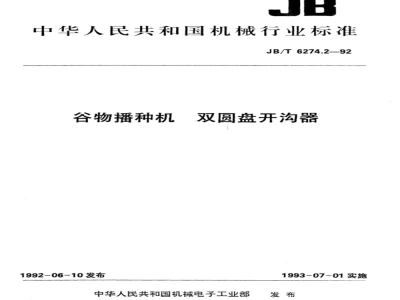 本标准规定了谷物播种机所用的双圆盘开沟器的类型、主要参数与尺寸、技术要求、试验方法、验收规则、标志和包装。 本标准适用于播种谷物、大豆等作物的谷物播种要所采用双圆盘开沟器。 JB/T 6274.2-1992 谷物播种机 双圆盘开沟器 JB/T6274.2-1992 标准下载解压密码:www.bzxz.net