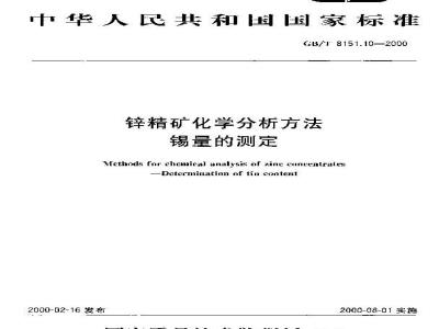 本标准规定了锌精矿中锡含量的测定方法。本标准适用于锌精矿中锡含量的测定。测定范围:0.0030%~0.50%。 GB/T 8151.10-2000 锌精矿化学分析方法 锡量的测定 GB/T8151.10-2000 标准下载解压密码:www.bzxz.net