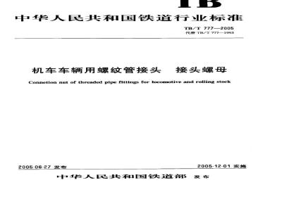 本标准于1961年首次发布,1968、1974、1984、1993均为修订版,本次修订为第五次修订。本标准代替TB/T 777-1993《活接头螺母》本标准规定了接头螺母的型式、尺寸、材料及标记。本标准适用于机车车辆上使用温度为-40℃~200℃ 公称压力小于或等于4.0MPa的钢制接头螺母。 TB/T 777-2005 机车车辆用螺纹管接头 接头螺母 TB/T777-2005 标准下载解压密码:www.bzxz.net