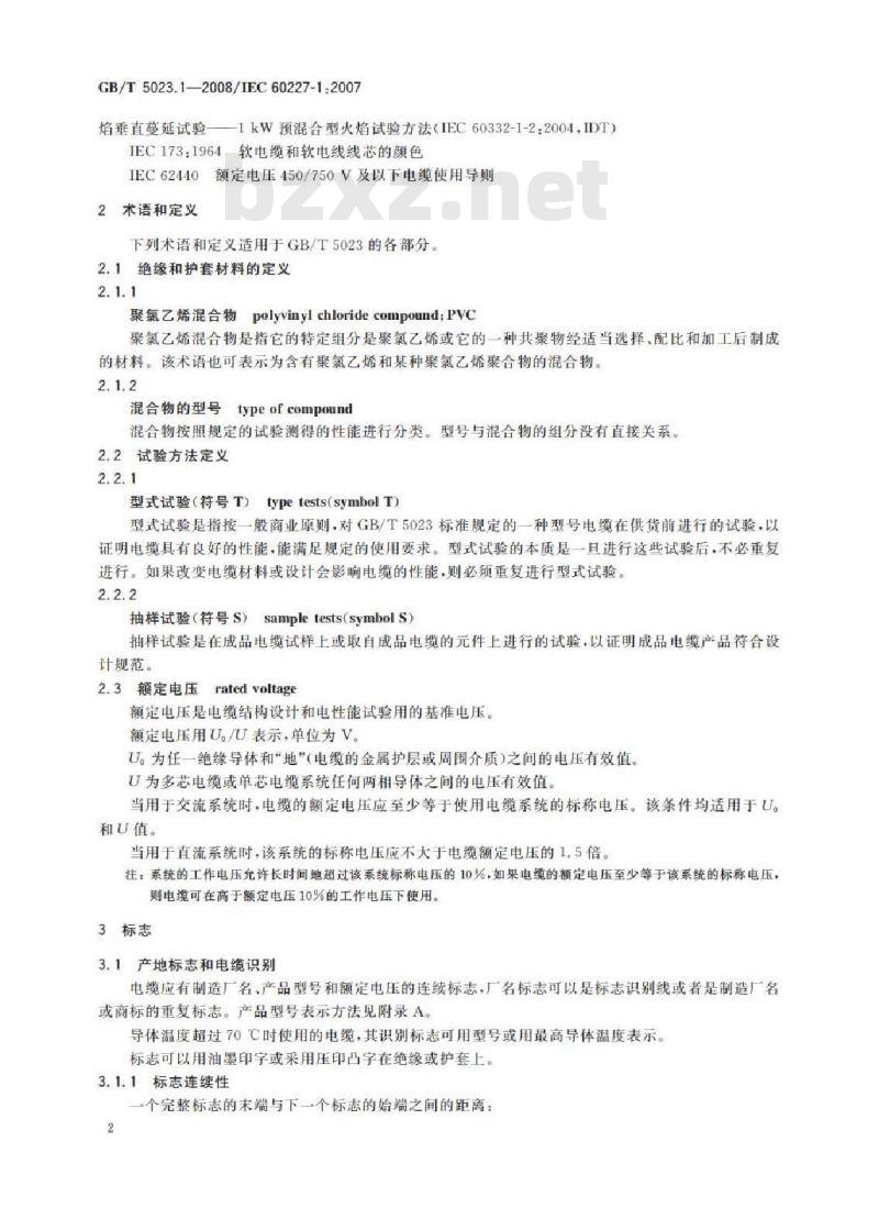 GB/T5023的本部分适用于额定电压U。/U为450/750V及以下聚氯乙烯绝缘和护套(若有)软电缆和硬电缆,用于交流标称电压不超过450/750V的动力装置。注:对某些型号的软电缆,可使用术语“软线”。各种型号的电缆规定在GB/T5023.3,GB/T5023.4等标准中。电缆的型号表示方法见附录A。在GB/T5023的第1、第3和第4等部分中规定的试验方法见GB/T5023.2、GB/T18380.12-2008和GB/T2951—2008的相关部分。1.2规范性引用文件