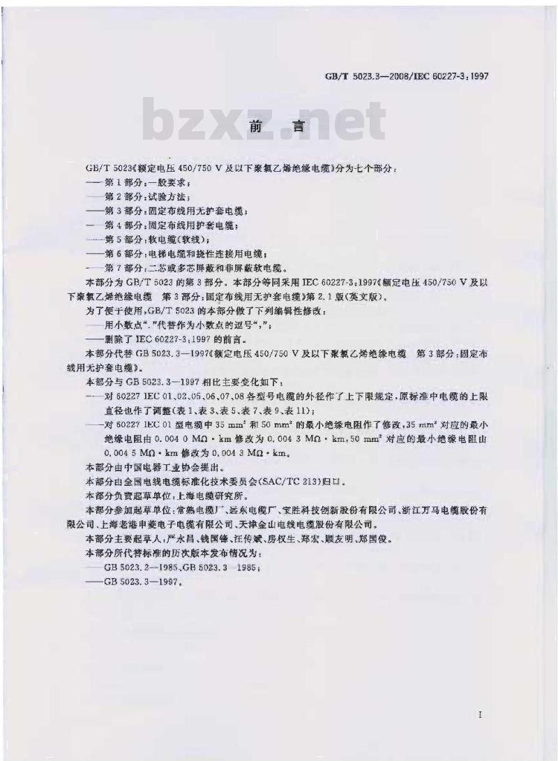本部分与GB5023.3—--1997相比主要变化如下:对602271EC01、02.05.06.07、08各型号电缆的外径作了上下限规定,原标准中电缆的上限直径也作了调整(表1、表3.表5.表7、表9、表11);对60221IEC01型电缆中35mm和50mm的最小绝缘电阻作了修改,35mm2对应的最小绝缘电阻由0.0040Mn·km修改为0.0043MQ·km,50mm对应的最小绝缘电阻山0.0045Mn.km修改为0.0043Mn.km.本部分由中国电器工业协会提出。本部分出全国电线电缆标准化技术委员会(SAC/TC213)归口。本部分负责起草单位:上海电缆研究所。本部分参加起草单位:常熟电缆厂,远东电缆厂、宝胜科技创新股份有限公司,浙江万马电缆股份有限公司,上海老港申菱电子电缆有限公司、天津金山电线电缆股份有限公司。本部分主要起草人严永昌、钱国锋、汪传斌、房权生、郑宏、顾友明,郑国俊。本部分所代替标的历次版本发布情况为:GB5023.2--1985GB5023.31985: