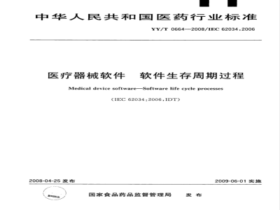 本标准等同采用IEC 62034:2006《医疗器械软件 软件生存周期过程》(英文版)。IEC 62034:2006《医疗器械软件 软件生存周期过程》给出了在第3章中定义的术语索引,本标准将该索引删除。本标准中带星号(*)的条款表示在附录B中有关于该条款的指南。IEC 62034:2006《医疗器械软件 软件生存周期过程》(英文版)中的术语和附录C部分引用ISO 14971:2000条款,由于ISO 14971:2007版已经发布,本标准中引用YY/T 0316-2008/ISO 14971:2007的相应部分。本标准规定了医疗器械软件的生存周期要求。在本标准中描述的一组过程、活动和任务,为医疗器械软件生存周期过程建立了共同的框架。本标准适用于医疗器械软件的开发和维护。当软件本身是医疗器械,或当软件是最终医疗器械的嵌入部分或组成部分时,本标准适用于该医疗器械软件的开发和维护。本标准不覆盖医疗器械的确认和最终发行,即使当该医疗器械完全由软件组成时。 YY/T 0664-2008 医疗器械软件 软件生存周期过程 YY/T0664-2008 标准下载解压密码:www.bzxz.net