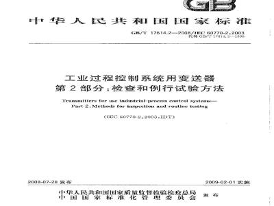 GB/T 17614.22008/1EC 60770-2:2003GI3/T17614《二业过程控制系统用变送器》分为以下二部分:第1部分:性能评定方法;