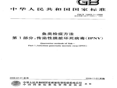 GB/T15805鱼类检疫方法》分为下列部分:第1部分:传染性胰脏坏死病带(IPNV);言