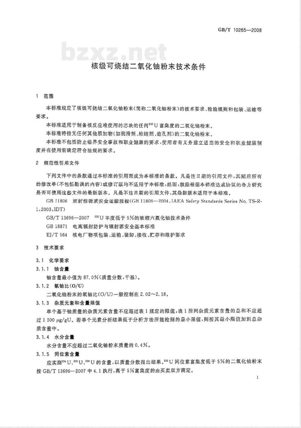 本标准代替GB/T 10265-1998《核级可烧结二氧化铀粉末技术条件》。本标准规定了核级可烧结二氧化铀粉末的技术要求、检验规则和包装、运输等要求。本标准适用于制备核反应堆使用的芯块的任何235U富集度的二氧化铀粉末。本标准特指无任何其他添加物(如润滑剂、粘结剂、造孔剂)的二氧化铀粉末。本标准不包括防止临界安全事故和职业健康的要求,使用者有义务建立适当的安全和职业健康制度并在使用前确定符合法规的要求。本标准与GB/T 10265-1998相比,主要变化如下:a)“范围”的内容作部分修改(见第1章);b)引用的标准改变(见第2章);c)氧铀比由“2.05~2.18”改为“2.02~2.18”(见3.1.2);d)“核要求”合并至“化学要求”中,并在“化学要求”中增加“清洁度”(1998年版的3.2和3.1;本版的3.1);e)“表2 当量硼含量因子”部分修改(1998年版的3.2.2;本版的3.1.6);f)“颗粒尺寸”中“0.40mm”改为“425μm”(1998年版的3.3.1;本版的3.2.1)g)“粉末批要求”中“批定义”内容修改(见第5章);h)“取样”内容全修改(见6.1);i)增加了“证明文件”(见第7章);j)“包装、标志、运输、贮存”内容作部分修改(1998年版的第7章;本版的第8章);k)可烧结性试验中增加了外观检查,并对部分内容作了修改(见附录C);l)增加本标准条款和ASTM C753:2004标准条款的对照一览表(见附录A);m)增加本标准与ASTM C753:2004标准的技术性差异及其原因的一览表(见附录B)。 GB/T 10265-2008 核级可烧结二氧化铀粉末技术条件 GB/T10265-2008 标准下载解压密码:www.bzxz.net
