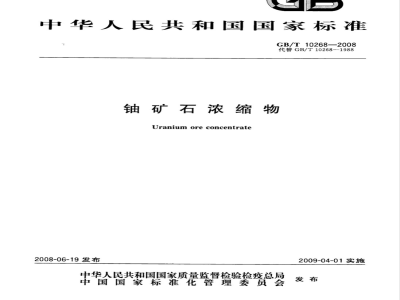 本标准和ASTMC967:2002a相比,主要技术差异是:在杂质含量不罚款限值中,钛0.02%宽于ASTMC967:2002a中的0.01%,钒、碳、针要求严于ASTMC967:2002a标准要求。本标准代替GB/T102681988《铀矿石浓缩物》。本标准和GB/T10268--1988相比主要变化如下:-增加了前言;