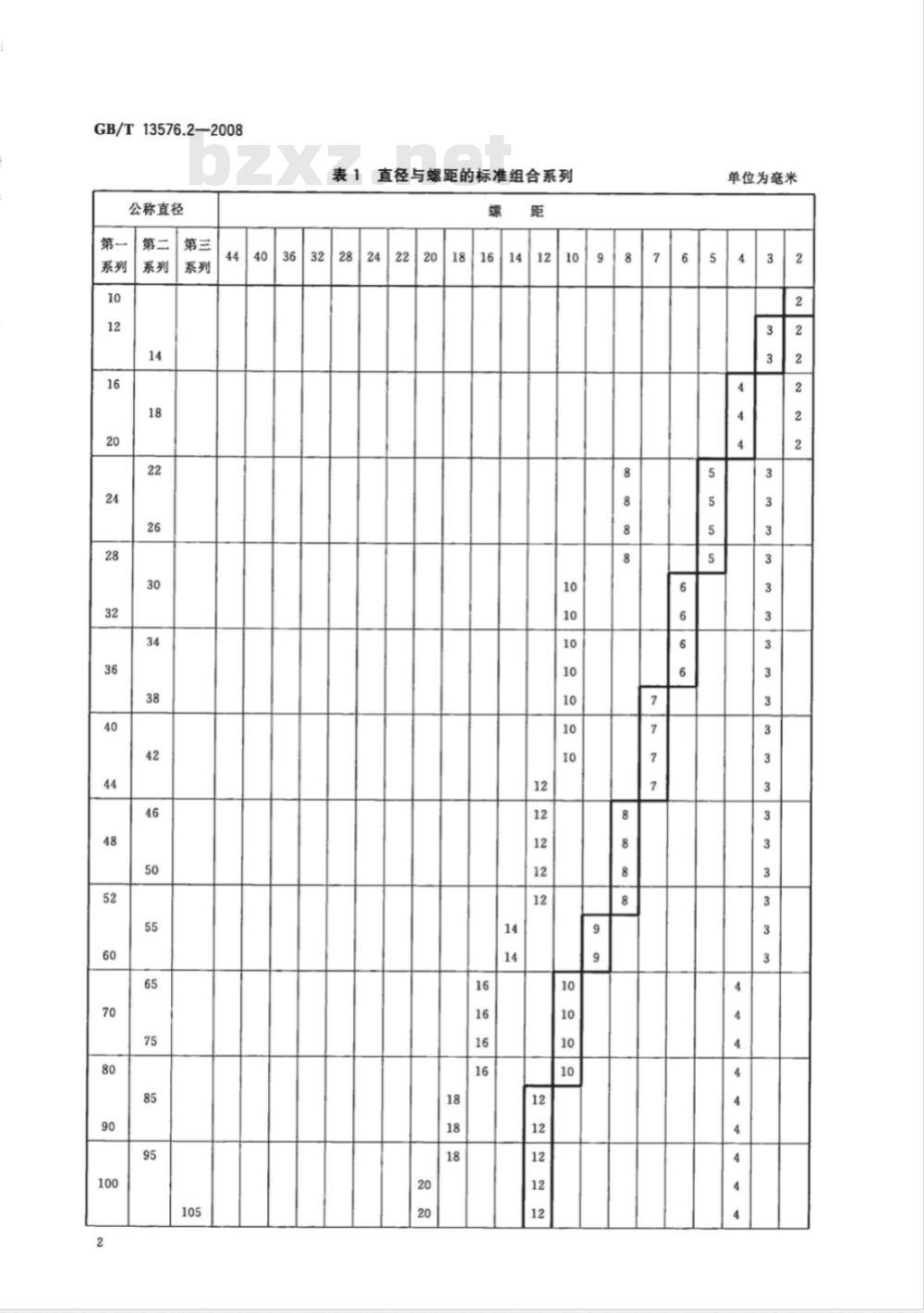 锯齿形螺纹的直径与螺距标准组合系列见表1。表1中,优先选用第一系列直径,其次选用第二系列直径。新产品设计中,不宜选用表1内的第三系列直径。表1中,应选择与直径处于同一行内的螺距。优先选用粗黑框内的螺距。如果需要使用表1规定以外的螺距,则选用表中邻近直径所对应的螺距5