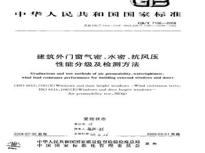 代替GB3/T7105~7108-2002、G13/T13685~13686-1992建筑外门窗气密、水密、抗风压性能分级及检测方法