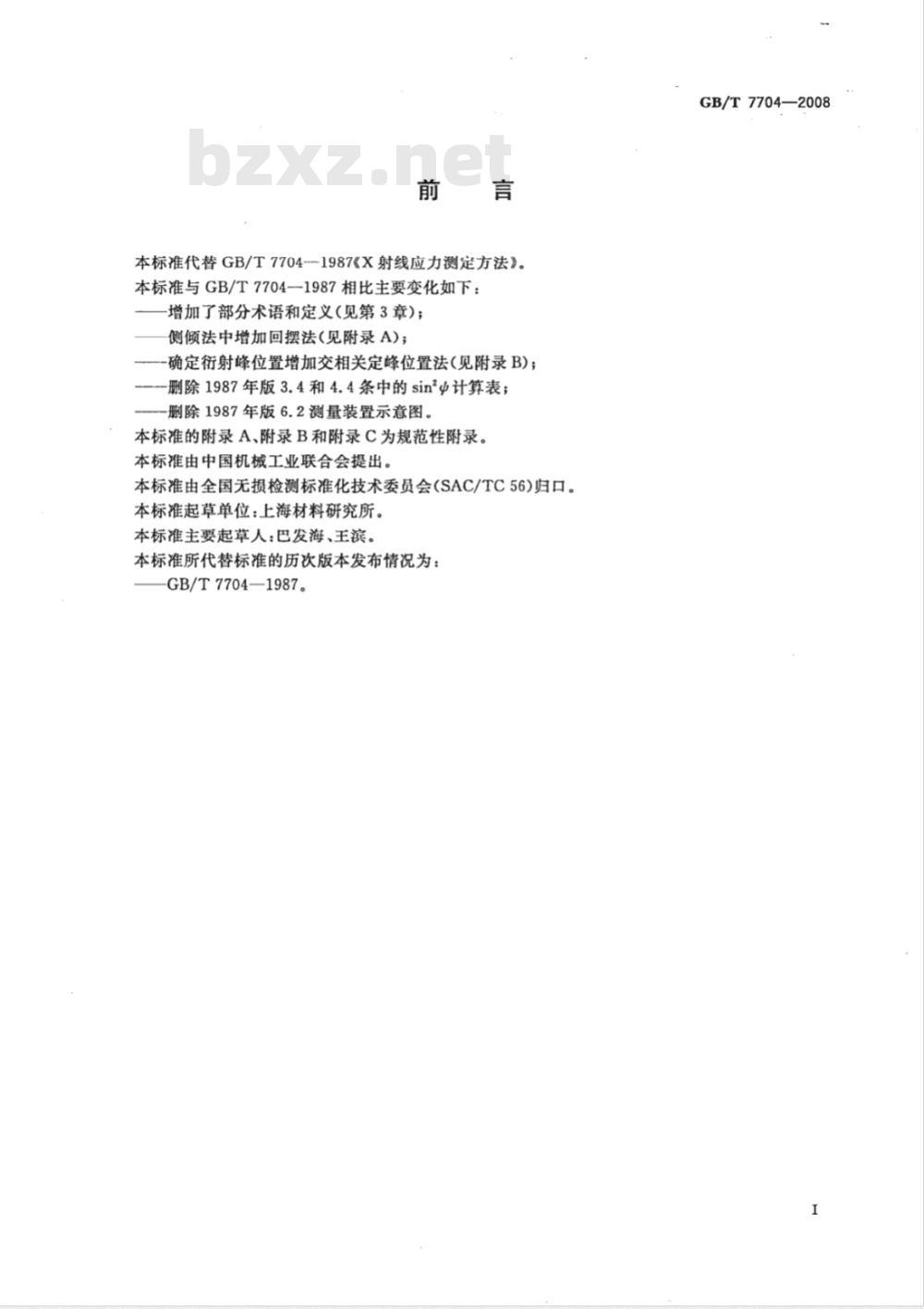 本标准代替GB/T7704-1987《X射线应力测定方法》。本标准与GB/T7704-1987相比主要变化如下:增加了部分术语和定义(见第3章);侧倾法中增加回摆法(见附录A);-确定衍射峰位置增加交相关定峰位置法(见附录B);删除1987年版3.4和4.4条中的sinΦ计算表;删除1987年版6.2测量装置示意图。本标准的附录A、附录B和附录C为规范性附录。本标准由中国机械工业联合会提出。本标准由全国无损检测标准化技术委员会(SAC/TC56)归口。本标准起草单位:上海材料研究所。本标准主要起草人:巴发海、王滨。本标准所代替标准的历次版本发布情况为:GB/T7704—1987。