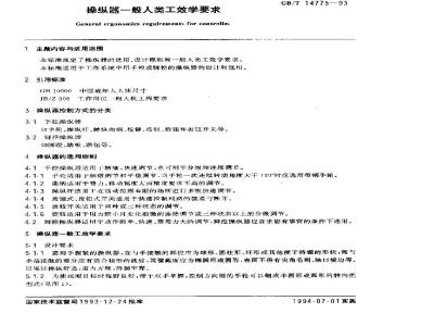 本标准规定了操纵器的选用、设计原则和一般人类工效学要求。本标准适用于工作系统中用手控或脚控的操纵器的设计和选用。 GB/T 14775-1993 操纵器一般人类工效学要求 GB/T14775-1993 标准下载解压密码:www.bzxz.net