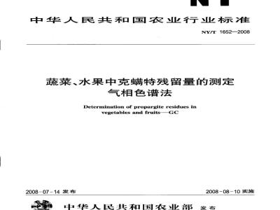 NY/T 1652-2008 蔬菜、水果中克螨特残留量的测定 气相色谱法 NY/T1652-2008 标准下载解压密码:www.bzxz.net