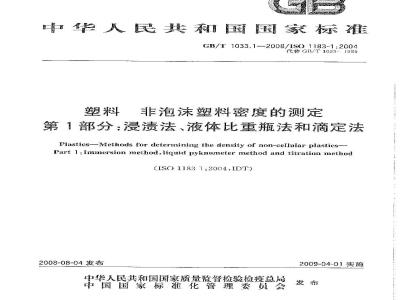 GB/T1033.1—2008/ISO1183-1:2004GB/T1033《塑料非泡沫塑料密度的测定》分为以下三个部分:-第1部分:浸渍法.液体比重瓶法和滴定法;第2部分:密度梯度柱法;