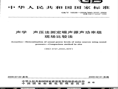 英文名称:Acoustics - Determination of sound power levels of noise sources using sound pressure - Comparison method in situ