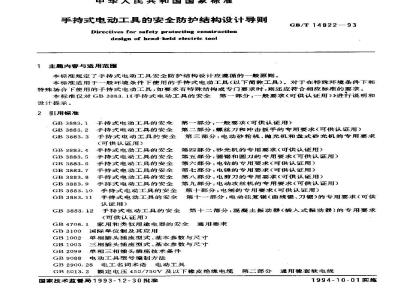 GB3883.1、手持式电动工具的安全第一部分:一般要求(可供认证用)GB3883.2手持式电动工具的安全第二部分:螺丝刀和神击扳手的专用要求(可供认证用)GB3883.3手持式电动工具的安全第三部分:电动砂轮机,抛光机和盘式砂光机的专用要求(可供认证用)