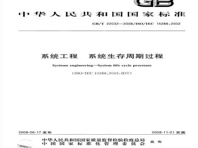 GB/T22032--2008/ISO/IEC15288:2002本标准等同采用国际标准ISO/IEC15288:2002《系统工程系统生存周期过程》(英文版)。本标准的附录A是规范性附录,附录B、附录C和附录D是资料性附录。本标准由中华人民共和国信息产业部提出。本标准由全国信息技术标准化技术委员会归口。本标准起草单位:中国电子技术标准化研究所。本标准主要起草人:周平、高林、王宝艾、王立福、刘超。I