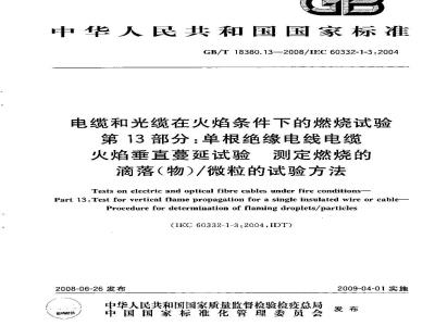 GB/T18380的本部分规定了评定单根垂直电线电缆或光缆在规定的火焰条件下燃烧的滴落(物)/微粒的试验方法。