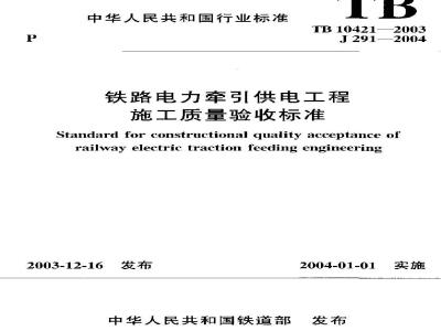 本标准适用于旅客列车设计行车速度等于货小于160km/h的客货列车共线运行的新建、改建标准规矩,牵引网采用单相工频(50Hz),接触 网额定电压25kV或2×25kV多种供电制式的铁路电力牵引供电工程施工质量的验收。 TB 10421-2003 铁路电力牵引供电工程施工质量验收标准(附条文说明) TB10421-2003 标准下载解压密码:www.bzxz.net
