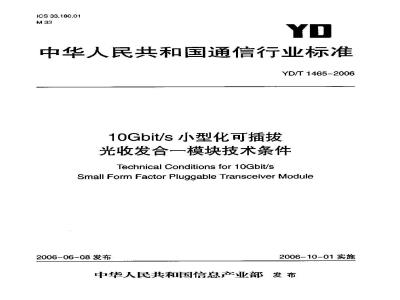 YD/T1465-2006《10Gbit/s小型化可插披光收发合--模块技术条件》随着技术的发展,还将制定后续的相关标准。本标准在制定过程中考虑了我国光模块实际研制情况,参考了国际电信联盟电信部门建议ITU-TG691、电气电子工程师协会标准EEE802.3ae、美国TelcordiaGR-468-core、MIL-STD-883E,以及XFPMSA组织的接口规范文件。