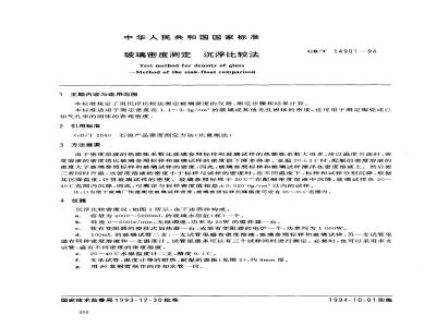 本标准规定了用沉浮比较法测定玻璃密度的仪器、测定步骤和结果计算。本标准适用于测定密度在1.1~3.3g/cm3的玻璃或其他无孔固体的密度,也可用于测定陶瓷或已知气孔率的固体的表观密度。 GB/T 14901-1994 玻璃密度测定 沉浮比较法 GB/T14901-1994 标准下载解压密码:www.bzxz.net