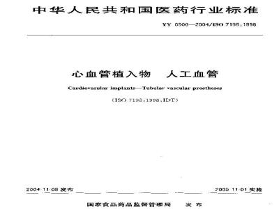 本标准规定了无菌人工血管的测试方法、包装、标志及术语要求,无菌人工血管是指可以置换、旁路移植或分流人体血管系统任一部分的人工血管。本标准所指的人工血管可以完全或部分是由生物材料、合成编织型材料、合成非编织型材料制成的。此外,在标准中也对组合型人工血管和混合型人工血管的特征区别作出了说明。本标准还规定了人工血管原材料的名称和结构以及人工血管长度和直径的名称。本标准对人工血管原材料及成品的生物学要求,参考了GB/T 16886的规定。本标准规定了人工血管各项机械力学性能的名称。而且在本标准中还列出了部分制造者对人工血管几何形状和机械力学性能的测试测量方法。本标准还提到了人工血管的灭菌方法,并对产品的包装和标志做出了规定。在本标准中还列出了关于人工血管一些常用术语的定义。 本标准所列出的测试方法、结果及其他信息只适用于负责制定外科植人物规章的国家权威机构的要求。本标准不适用于由人类捐赠的血管如冷冻人工血管。也不适用于各类补片、垫片和支架。 YY 0500-2004 心血管植入物 人工血管 YY0500-2004 标准下载解压密码:www.bzxz.net