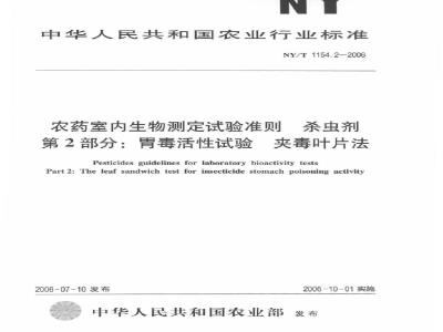 《农药室内生物测定试验准则杀虫剂》为系列标准本部分是《农药室内生物测定试验准则杀虫剂》的第2部分。本标准由中华人民共和国农业部提出并归口。本标准起草单位:农业部农药检定所。本标准主要起草人:姜辉、欧晓明、倪珏萍、陶岭梅、王晓军、曹兵伟、本标准由农业部农药检定所负责解释。NY/T1154.2—2006