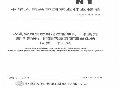 《农药室内生物测定试验准则杀菌剂》为系列标准。本部分是《农药室内生物测定试验准则杀菌剂》的第2部分。本标准由中华人民共和国农业部提出并归口。本标准起草单位:农业部农药检定所。本标准主要起草人:朱春雨、吴新平、徐文平、张弘、邱涧平、李钟华。本标准由农业部农药检定所负责解释。NY/T1156.2—2006