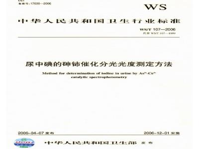 本标准与WS/T107—1999相比主要变化如下:采用过硫酸铵取代氯酸消化尿样。适于在20℃~35℃之间某一稳定的室温或者控温条件下进行测定。明确了尿样保存条件和样品碘含量的计算方法,本标准由卫生部全国地方病寄生虫病标准委员会提出。本标准由中华人民共和国卫生部批准。本标准起草单位:天津医科大学内分泌研究所、福建省厦门市疾病预防控制中心、国家碘缺乏病参照实验室、安徽省疾病预防控制中心、陕西省地方病防治研究所。本标准主要起草人:阎玉芹、张亚平、刘列钧、刘嘉玉,李卫东、华基礼、陈祖培。本标准所代替标准的历次版本发布情况为:WS/T107—1999。1范围