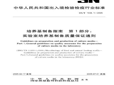 SN/T1538培养基制备南分为两个部分:第1部分:实验室培紧基制备质量证猫购第2部分;培养基性能洲试实用指南SN/T 1538. 1—2005