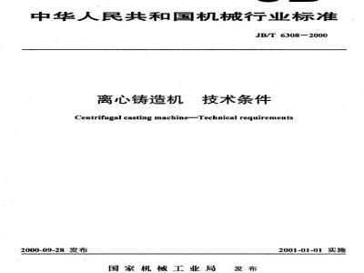 JB/T 6308-2000 本标准是对JB/T 6308-1992《离心铸管机 技术条件》的修订。修订后的标准适用范围有增加;增加了“术语”、对主要零件材质的要求;噪声限值根据电动机的功率进行了分档;删除了首次大修期规定。 本标准规定了离心铸造机的术语,技术要求,几何精度,试验方法和检验规则。 本标准适用于卧式悬臂离心铸造机(直径为大于1m、长度不大于1m)、立式离心铸造机(直径不大于1.8m、高度不高于0.8m)和卧式托轮滚式离习铸造机(直径不大于1m、长度不大于6m)。 本标准于1992年首次发布。 JB/T 6308-2000 离心铸造机 技术条件 JB/T6308-2000 标准下载解压密码:www.bzxz.net