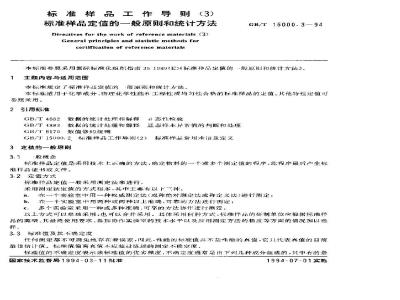 标准样品定值的一般原则和统计方法Directives for the work of reference materials (3)General principles and statistic methods fntcertificalion of reference materialsGB/T15000.3—94